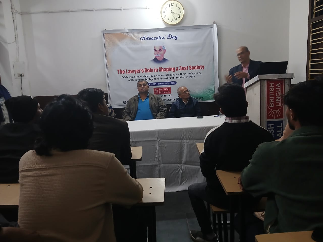 राजधानी पटना के बोरिंग रोड क्रॉसिंग स्थित ब्रिटिश लिंगुआ परिसर में बुधवार को एक विशेष सेमिनार का आयोजन किया गया। यह कार्यक्रम ‘एडवोकेट्स डे’ और भारत के प्रथम राष्ट्रपति, देशरत्न डॉ. राजेंद्र प्रसाद की जयंती को समर्पित था। सेमिनार का मुख्य विषय “न्यायपूर्ण समाज के निर्माण में वकीलों की भूमिका” था, जिसमें कानूनी पेशे की जिम्मेदारियों पर गहन चर्चा हुई।