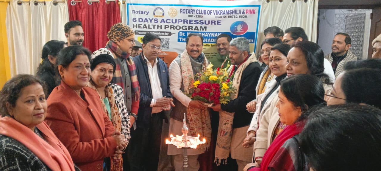 भागलपुर, 9 जनवरी 2026: Acupressure Camp: दवाइयों की कड़वाहट से मुक्ति और बिना सुई के उपचार का मंत्र लेकर, भागलपुर की धरती पर एक नई स्वास्थ्य क्रांति का उदय हुआ है। आज रोटरी विक्रमशिला और रोटरी पिंक क्लब के संयुक्त तत्वावधान में राम मनोहर लोहिया आरोग्यम संस्था, राजस्थान के सहयोग से एक 6-दिवसीय एक्यूप्रेशर स्वास्थ्य शिविर का भव्य शुभारंभ पटल बाबू रोड स्थित नियो फिटनेस कैंपस में किया गया। इस अनूठी Bhagalpur health initiative का उद्देश्य शहरवासियों को प्राकृतिक और दवा-मुक्त उपचार पद्धति से परिचित कराना है।