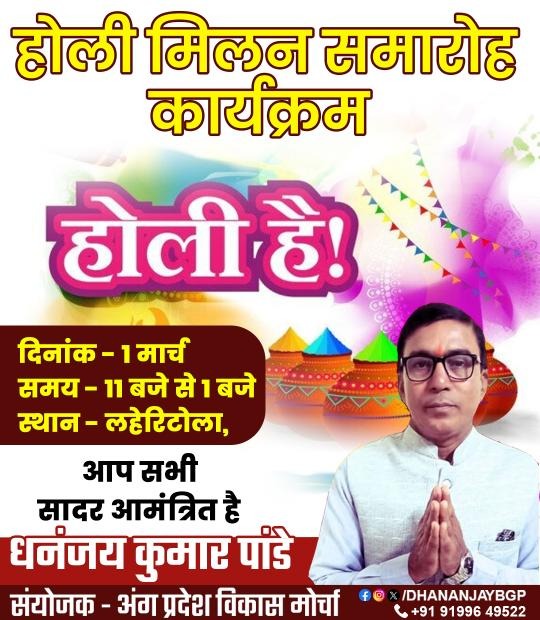 Holi Milan Samaroh: जब फिजा में गुलाल की महक घुलने लगे और दिलों में फागुन की मस्ती छाने लगे, तो समझ लीजिए कि होली का त्योहार दहलीज पर है। इसी उत्साह और उमंग को दोगुना करने के लिए अंग प्रदेश विकास मोर्चा ने लहेरी टोला स्थित शिव मंदिर के प्रांगण में आगामी 1 मार्च 2026 को एक भव्य होली मिलन समारोह के आयोजन की घोषणा की है। इस कार्यक्रम का मुख्य उद्देश्य होली के पावन अवसर पर समाज के सभी वर्गों को एक मंच पर लाकर प्रेम, सद्भाव और एकता का संदेश देना है। संगठन के पदाधिकारियों ने बताया कि इस अवसर पर संगठन के सभी कार्यकर्ता एवं स्थानीय नागरिक बड़ी संख्या में उपस्थित रहेंगे। आप पढ़ रहे हैं देशज टाइम्स बिहार का N0.1।