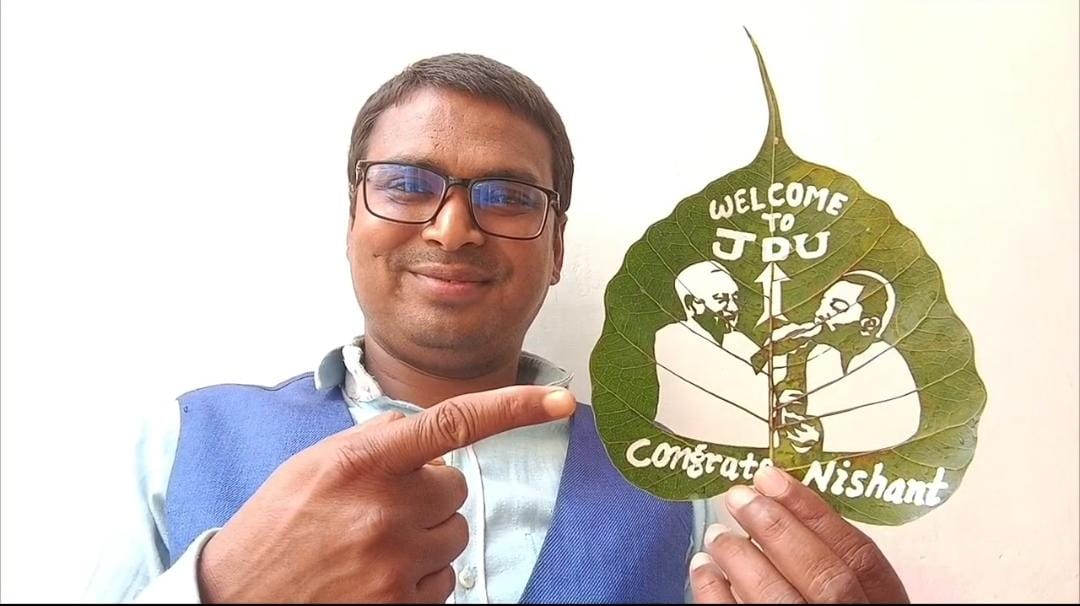 अंतर्राष्ट्रीय स्तर पर अपनी पहचान बना चुके लीफ आर्टिस्ट मधुरेंद्र कुमार ने लगभग 3 सेंटीमीटर के पीपल के पत्ते पर यह बारीक कलाकृति तैयार की है। इस छोटी सी कलाकृति को बनाने में उन्हें करीब 5 घंटे का समय लगा। पत्ते पर उन्होंने न केवल मुख्यमंत्री नीतीश कुमार को निशांत कुमार को बधाई देते हुए दिखाया है, बल्कि उस पर ‘वेलकम टू जदयू, कांग्रेट्स निशांत’ का संदेश भी बेहद खूबसूरती से उकेरा है। आप पढ़ रहे हैं देशज टाइम्स बिहार का N0.1। यह कलाकृति सिर्फ एक बधाई संदेश नहीं, बल्कि कला के प्रति उनके समर्पण और जुनून का प्रतीक है। देश की हर बड़ी ख़बर पढ़ने के लिए यहां क्लिक करें: https://deshajtimes.com/news/national/