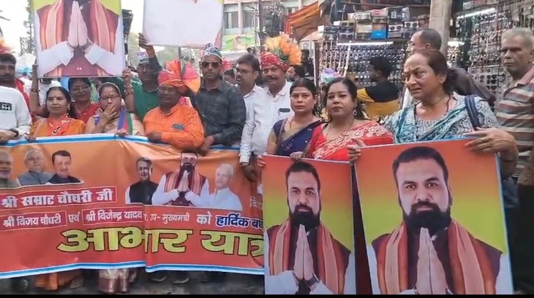 बिहार के मुख्यमंत्री बनने पर सम्राट चौधरी के अभिनंदन में राष्ट्रीय जनतांत्रिक गठबंधन (NDA) ने भागलपुर में एक भव्य आभार यात्रा का आयोजन किया। यह यात्रा स्टेशन चौक स्थित डॉ. अंबेडकर की प्रतिमा स्थल से शुरू हुई और शहर के विभिन्न प्रमुख मार्गों से गुजरते हुए भामाशाह चौक पर समाप्त हुई। मार्ग में जगह-जगह लोगों ने मुख्यमंत्री का जोरदार स्वागत किया।