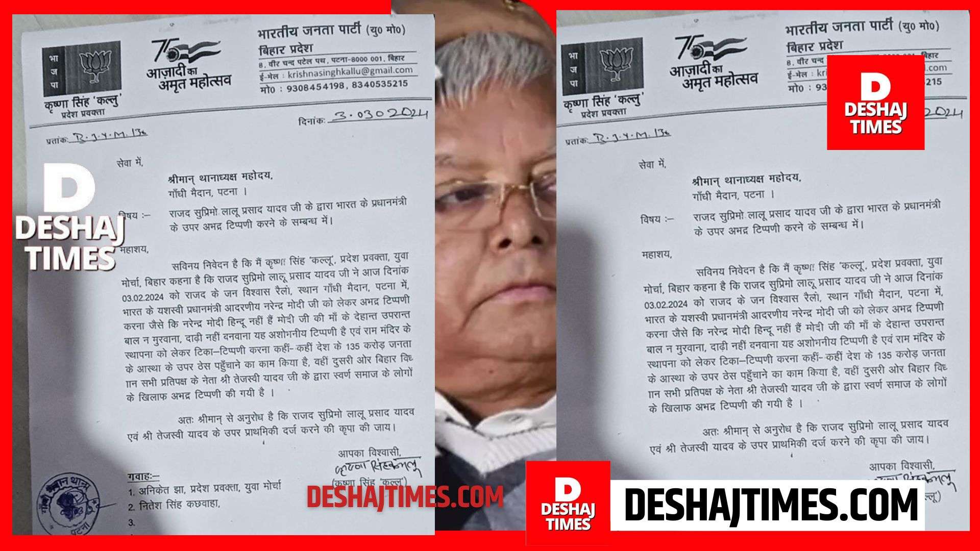 इस शिकायत में लिखा गया है कि राजद सुप्रीमो लालू प्रसाद यादव जी ने आज दिनांक 03.03.2024 को राजद के जन विश्वास रैली, स्थान गांधी मैदान, पटना में, भारत के यशस्वी प्रधानमंत्री नरेंद्र मोदी को लेकर अभद्र टिप्पणी करना जैसे कि नरेंद्र मोदी हिंदू नहीं हैं।
