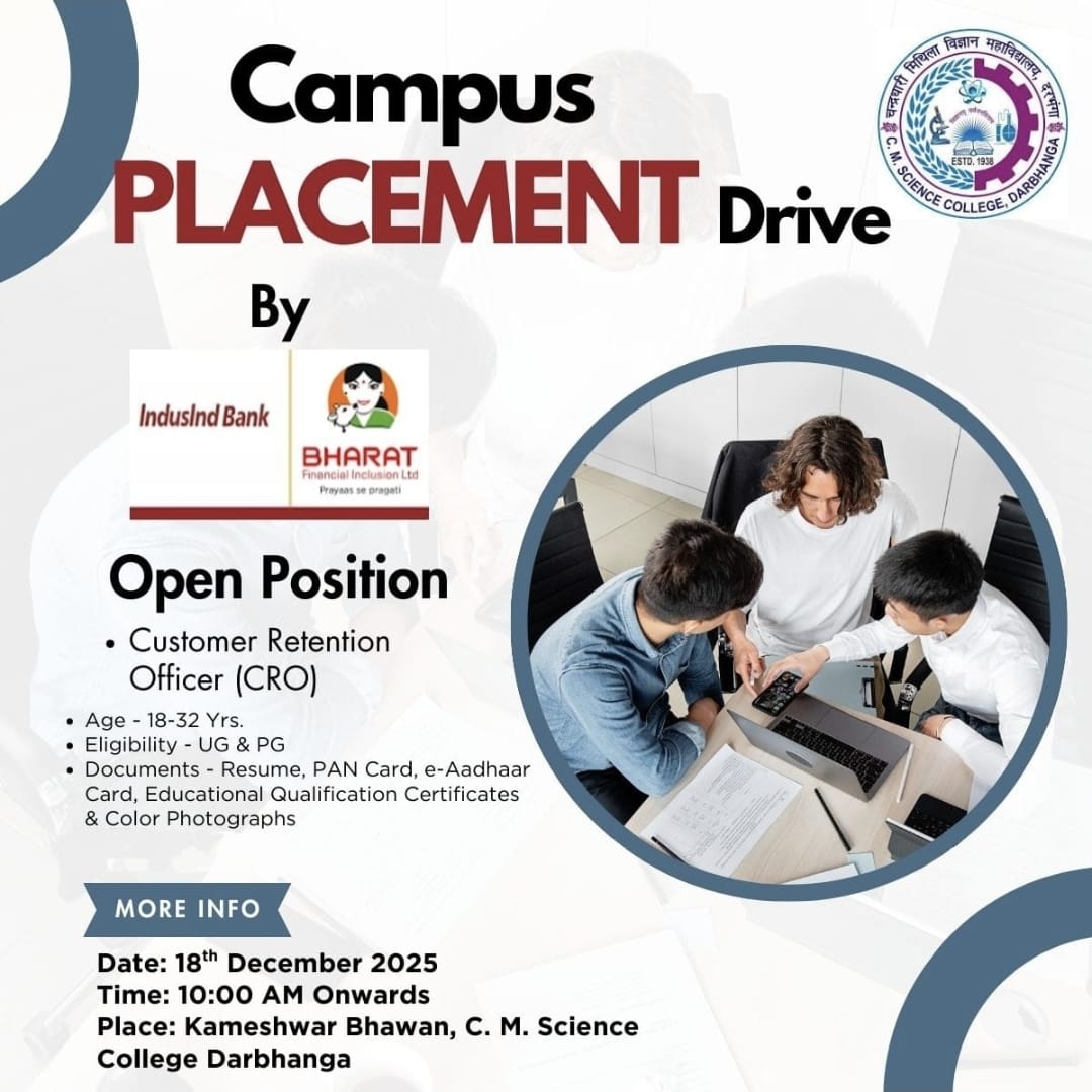 दरभंगा देशज टाइम्स।सीएम साइंस कॉलेज में 18 दिसंबर को एक बड़ा प्लेसमेंट ड्राइव आयोजित होने जा रहा है। इंडसलैंड बैंक में कस्टमर रिटेंशन ऑफिसर के पद पर नियुक्ति के लिए यह ड्राइव कॉलेज के आईक्यूएसी सेल द्वारा आयोजित किया जा रहा है, जिसमें 100 से अधिक रिक्तियों को भरा जाएगा।