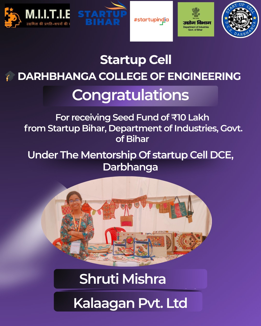 • कलांगन प्राइवेट लिमिटेड (श्रुति मिश्रा): “कलांगन – कलाओं का आंगन” एक दरभंगा-आधारित ब्रांड है जो पर्यावरण-अनुकूल उत्पाद बनाता है। इसके तहत जूट बैग, कैनवास उत्पाद और घर की सजावट का सामान तैयार किया जाता है। इसका उद्देश्य स्थानीय कला को बढ़ावा देना और महिला रोजगार का सृजन करना है।