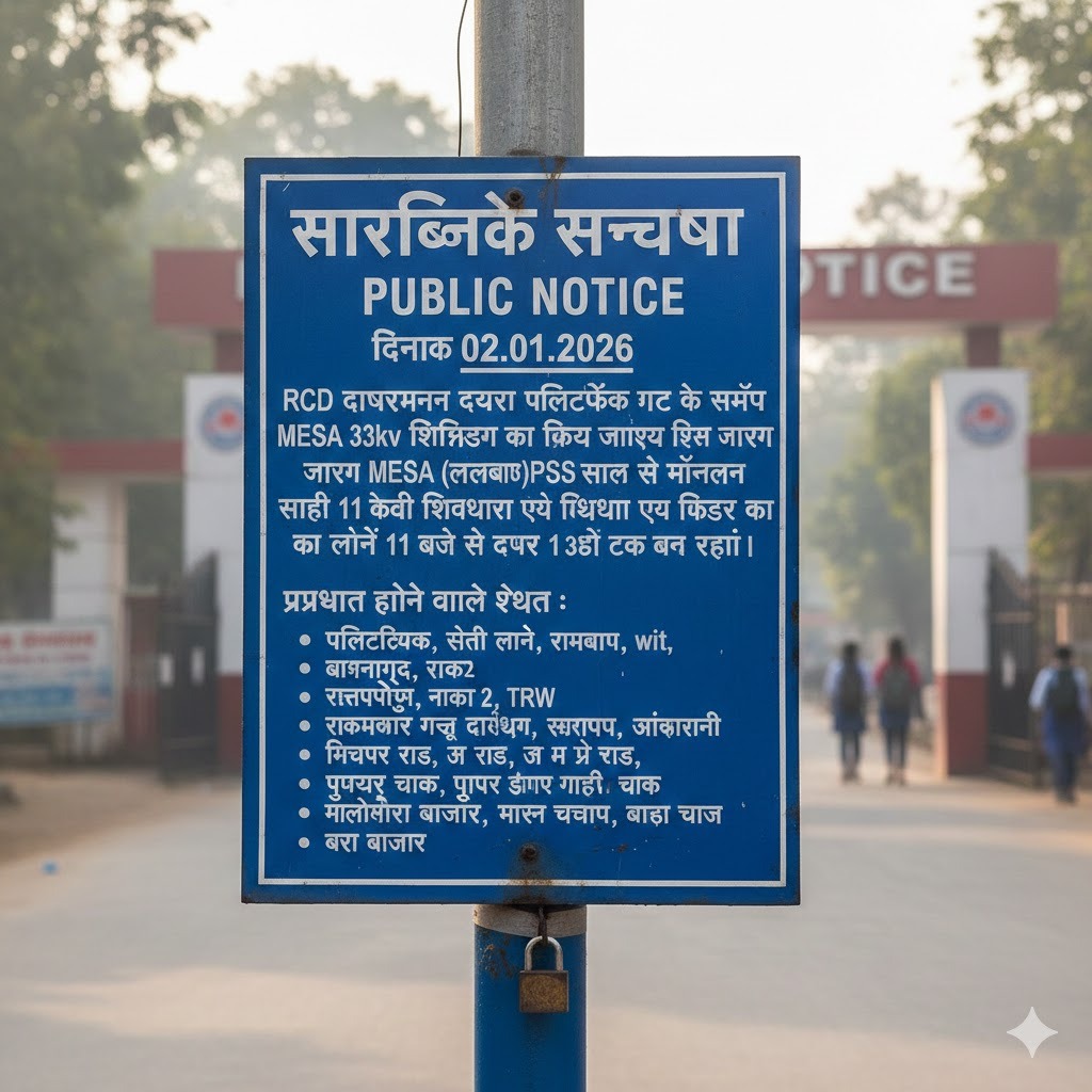 पथ निर्माण विभाग (RCD) द्वारा पॉलिटेक्निक गेट के पास 33kv लाइन की शिफ्टिंग का महत्वपूर्ण कार्य किया जाना है। यह कार्य दिनांक 2 जनवरी 2026, शुक्रवार को होगा। इस वजह से, मेसा (लालबाग) पावर सब-स्टेशन (PSS) और बेला PSS से निकलने वाले कई महत्वपूर्ण फीडरों को बंद रखने का निर्णय लिया गया है। विभाग द्वारा जारी सूचना के अनुसार, सुबह 11 बजे से लेकर दोपहर 1 बजे तक, यानी कुल दो घंटों के लिए बिजली आपूर्ति पूरी तरह से ठप रहेगी।