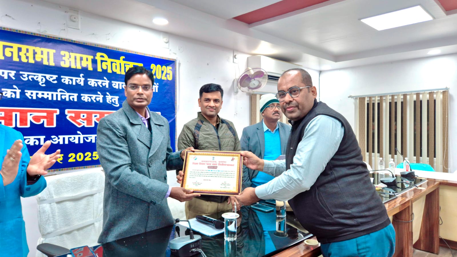 दरभंगा समाहरणालय स्थित अंबेडकर सभागार भवन में आयोजित एक गरिमामय समारोह में जिला पदाधिकारी, दरभंगा कौशल कुमार एवं वरिष्ठ पुलिस अधीक्षक जगुनाथरेड्डी जलारेड्डी ने संयुक्त रूप से प्रशांत कुमार झा को प्रशस्ति पत्र प्रदान कर सम्मानित किया। इस अवसर पर अपर जिला दंडाधिकारी मनोज कुमार, जिला भू-अर्जन पदाधिकारी बालेश्वर प्रसाद, जिला उप निर्वाचन पदाधिकारी सुरेश कुमार सहित अनेक सम्मानित पदाधिकारीगण उपस्थित रहे। इस सम्मान से जहां एक ओर निर्वाचन कार्यों में लगे कर्मचारियों का मनोबल बढ़ा है, वहीं दूसरी ओर ऐसे उत्कृष्ट योगदान को सार्वजनिक मंच पर पहचान मिली है।