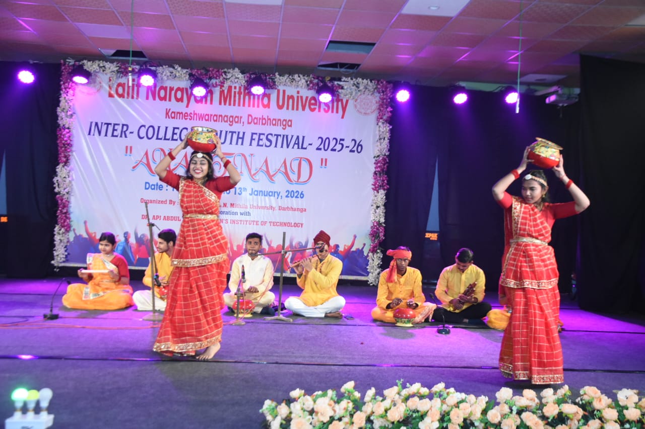 ललित नारायण मिथिला विश्वविद्यालय, दरभंगा परिसर में 10 से 13 जनवरी, 2026 तक आयोजित चार दिवसीय इंटर कॉलेज युवा महोत्सव 2025-26 “अनन्तनाद” अपने निर्धारित शेड्यूल के अनुसार दूसरे दिन भी जारी रहा। पीजी एथलेटिक्स एवं डॉ एपीजे अब्दुल कलाम डब्ल्यूआईटी, दरभंगा द्वारा आयोजित इस भव्य आयोजन में विभिन्न सांस्कृतिक एवं बौद्धिक प्रतियोगिताएं देखने को मिलीं।