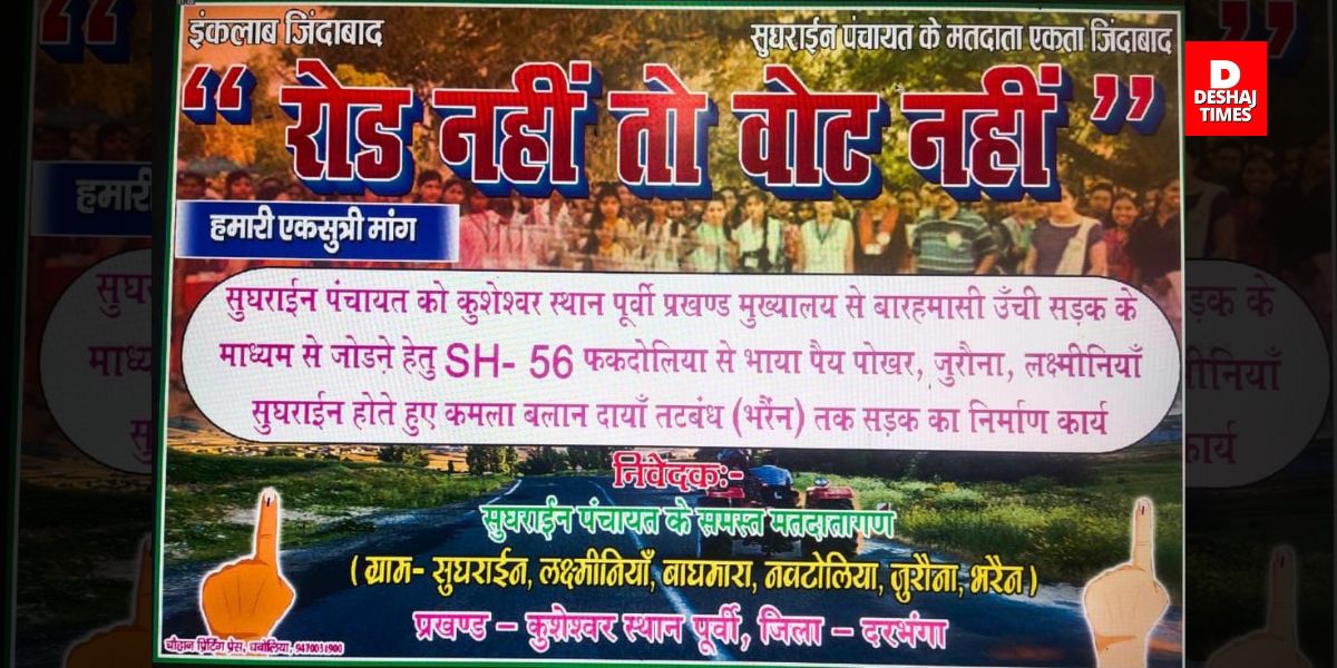 दरभंगा जिला के कुशेश्वरस्थान पूर्वी प्रखंड के सुघराईन पंचायत के ग्रामीणों ने आगामी 2025 के विधानसभा चुनाव में वोट बहिष्कार की चेतावनी दी है। ग्रामीणों ने अपनी मांगों को लेकर जगह-जगह बैनर लगाकर “रोड नहीं तो वोट नहीं” का नारा बुलंद किया है।