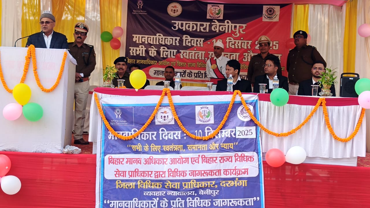 बेनीपुर न्यूज़: मानवाधिकार दिवस के मौके पर बेनीपुर व्यवहार न्यायालय परिसर में एक ऐसी बात गूंजी, जिसने समाज में समानता और सम्मान की नई अलख जगा दी। प्रधान जिला एवं सत्र न्यायाधीश शिव गोपाल मिश्र ने स्पष्ट संदेश देते हुए कहा कि कोई भी व्यक्ति अपनी जाति, धर्म या लिंग के कारण अपने अधिकारों से वंचित नहीं किया जा सकता। आखिर क्या था यह पूरा मामला और न्यायाधीश महोदय ने और क्या महत्वपूर्ण बातें कहीं, जानने के लिए पढ़िए पूरी खबर।