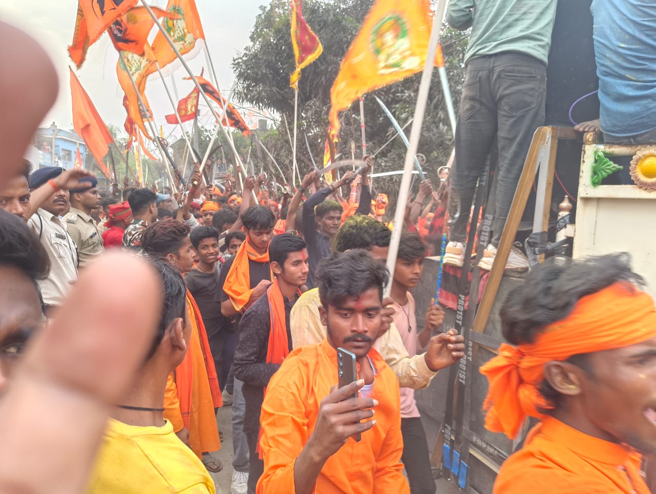 युवाओं की टोली धार्मिक नारों और भजनों की धुन पर जमकर झूम उठी। डीजे की धुन पर थिरकते हुए उन्होंने पूरे नगर की परिक्रमा की। इस शोभायात्रा के सफल आयोजन के लिए स्थानीय प्रशासन ने व्यापक तैयारियां की थीं। पर्व से चार दिन पहले गांव में एक शांति समिति की बैठक आयोजित की गई थी, जिसमें सभी धर्मों के अनुयायियों से शांतिपूर्वक पर्व मनाने की अपील की गई थी।