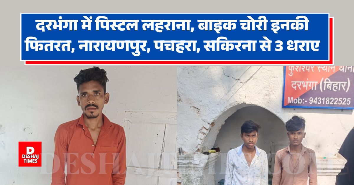 कुशेश्वरस्थान पूर्वी (दरभंगा), देशज टाइम्स — थाना क्षेत्र के विभिन्न गांवों में चलाए गए समकालीन अभियान के दौरान पुलिस ने तीन लोगों को संदिग्ध अवस्था में गिरफ्तार किया है। साथ ही एक चोरी की बाइक और पिस्टल बरामद की गई है।