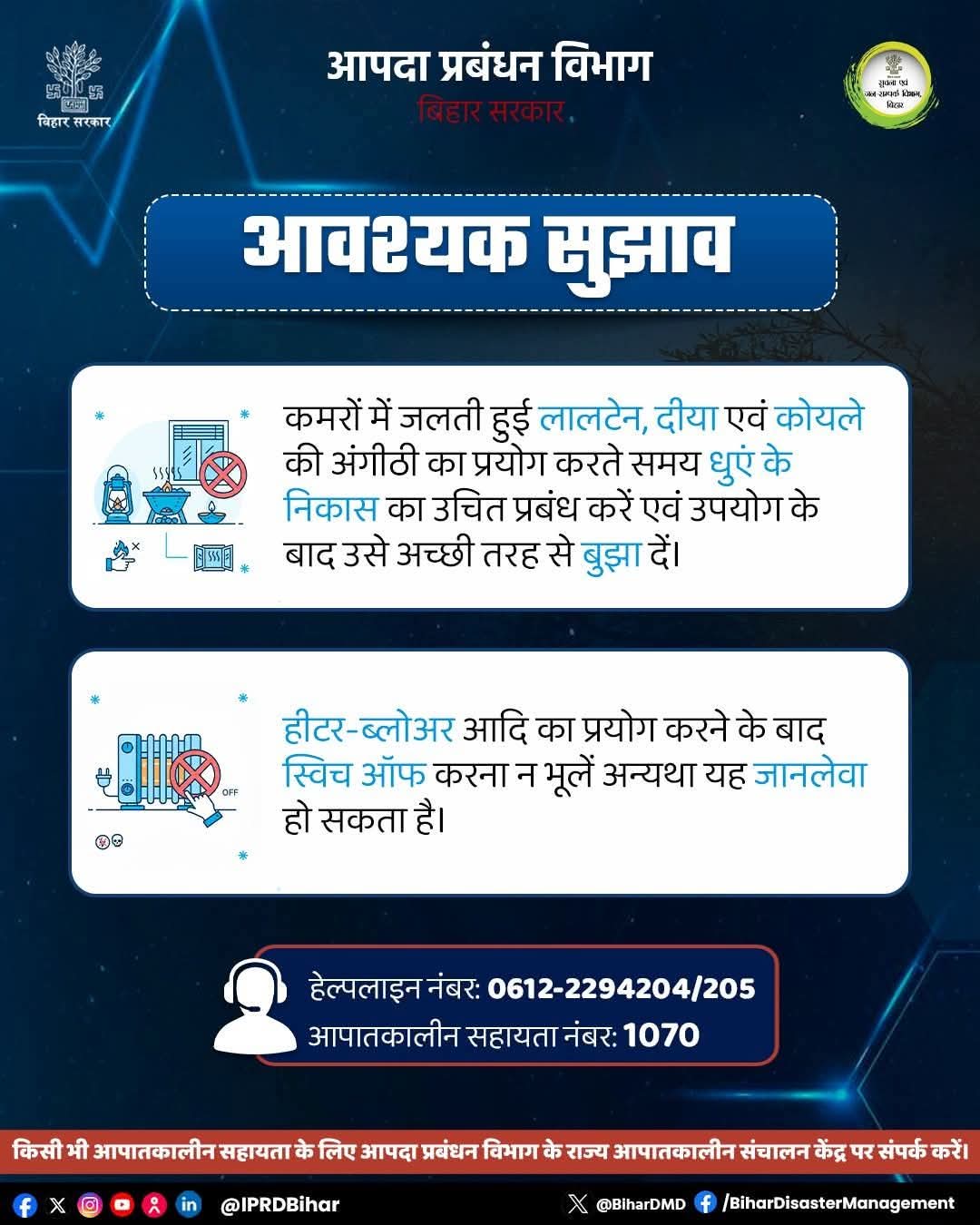 शीत लहर के संभावित खतरे को भांपते हुए पूर्व-तैयारी बेहद आवश्यक है। स्थानीय मौसम पूर्वानुमानों पर लगातार नज़र रखें, चाहे वह रेडियो, टीवी या समाचार पत्र हो, ताकि आपको आगामी दिनों में शीत लहर की संभावना की जानकारी मिल सके। अपने घर में सर्दियों के लिए पर्याप्त गर्म कपड़ों का स्टॉक करें। कपड़ों की कई परतें पहनना अधिक प्रभावी होता है, क्योंकि यह शरीर की गर्मी को बेहतर ढंग से बनाए रखता है। आपातकालीन आपूर्ति जैसे भोजन, पानी, ईंधन, बैटरी, चार्जर, आपातकालीन रोशनी और सामान्य दवाएं तैयार रखें। घर में ठंडी हवा के प्रवेश को रोकने के लिए दरवाजों और खिड़कियों को ठीक से बंद करें। ठंड में लंबे समय तक संपर्क में रहने के कारण फ्लू, नाक बहना/भरी नाक या नाक बंद जैसी विभिन्न बीमारियां हो सकती हैं। आप पढ़ रहे हैं देशज टाइम्स बिहार का N0.1। ऐसे लक्षणों से बचाव हेतु आवश्यक सावधानी बरतें और स्थानीय स्वास्थ्य कर्मियों या डॉक्टर से परामर्श करें।