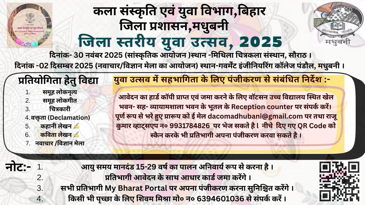 जिला स्तरीय युवा उत्सव 2025-26 मधुबनी के युवाओं के लिए एक अनमोल अवसर है, जहाँ प्रतिभा, कला और नवाचार एक मंच पर आकर एक उज्जवल भविष्य की नींव रखेंगे। जिला प्रशासन ने मधुबनी के सभी युवाओं से इस भव्य आयोजन में बढ़-चढ़कर भाग लेने की अपील की है।