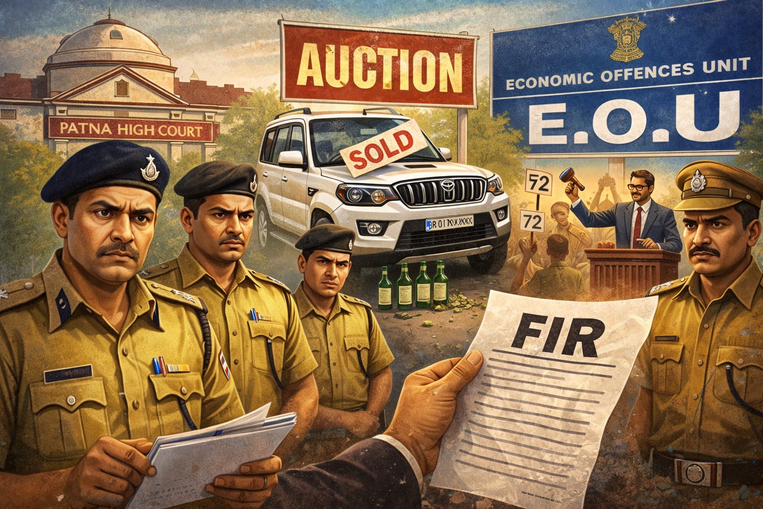 आर्थिक अपराध इकाई (EOU) ने पटना हाईकोर्ट के सख्त निर्देश पर बिहार के मुजफ्फरपुर जिले के तत्कालीन उत्पाद अधीक्षक, एक डीएसपी, थानाध्यक्ष और एक दारोगा के खिलाफ प्राथमिकी दर्ज की है। इन सभी आरोपी पदाधिकारियों पर आपराधिक षड्यंत्र, धोखाधड़ी और न्यायालय के आदेश की अवहेलना करते हुए एक जब्त स्कॉर्पियो गाड़ी को अवैध रूप से नीलाम करने का गंभीर आरोप है।