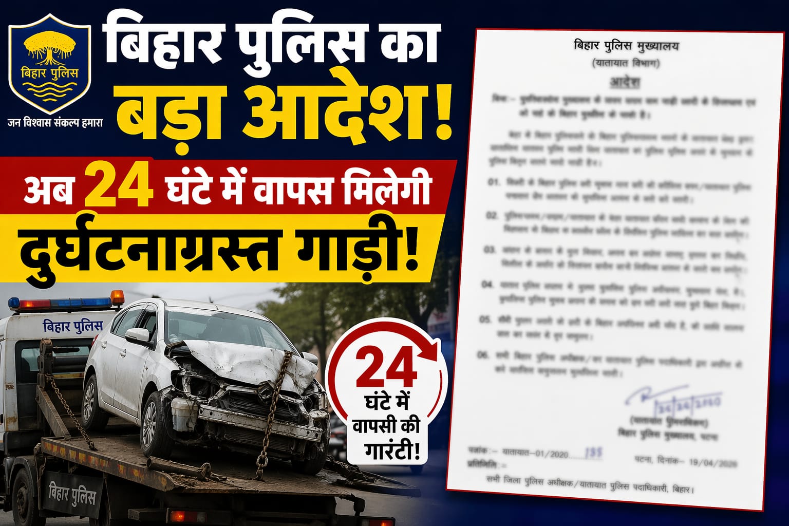 Bihar Accident Vehicle Release: अब बिहार में सड़क दुर्घटना के बाद आपकी गाड़ी यूं ही थाने में धूल नहीं खाएगी। बिहार पुलिस मुख्यालय ने एक बड़ा फैसला लेते हुए सभी जिलों के पुलिस अधीक्षकों को सख्त निर्देश जारी किए हैं कि दुर्घटनाग्रस्त वाहनों को अब 24 घंटे के भीतर उनके मालिक को लौटाना होगा। यह खबर उन हजारों लोगों के लिए राहत भरी है, जिन्हें अपनी गाड़ी छुड़ाने के लिए महीनों चक्कर लगाने पड़ते थे।