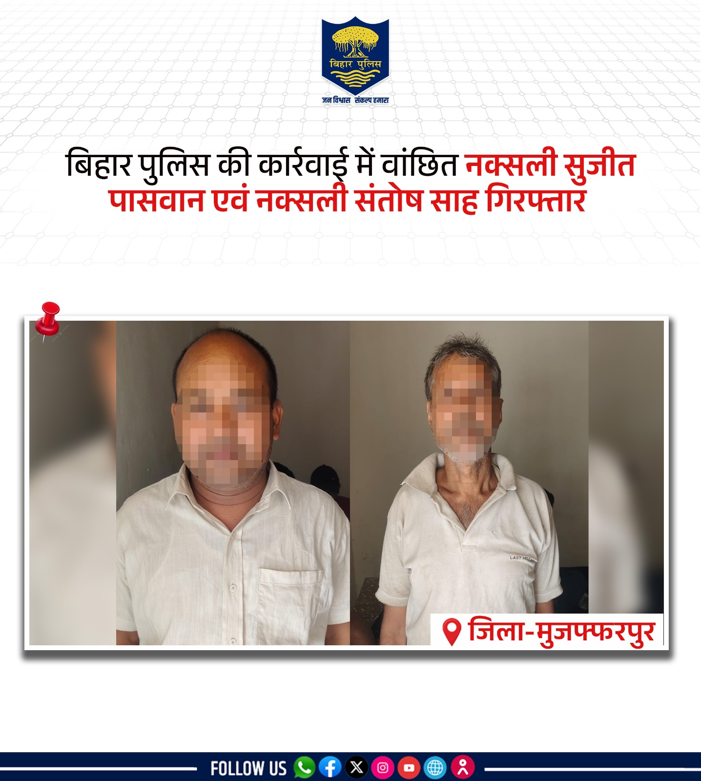 जानकारी के अनुसारबिहार एसटीएफ ने मुजफ्फरपुर में कई मामलों में वांछित दो माओवादियों, सुजीत पासवान और संतोष साह को वैशाली जिले से गिरफ्तार किया है। ये दोनों 13 साल पुराने आर्म्स एक्ट और एनआईए एक्ट के मामलों में फरार थे। सुजीत पर मुजफ्फरपुर में पांच और संतोष पर यूपी-बिहार में नौ नक्सल संबंधी मामले दर्ज हैं। टीम ने सुजीत पासवान को उसके घर से दबोचा। वह कुढ़नी (फकुली) थाना में वर्ष 2013 में दर्ज आर्म्स एक्ट और एनआईए एक्ट के मामले में वांछित था। उसके खिलाफ मुजफ्फरपुर जिले के विभिन्न थानों में हत्या, आर्म्स एक्ट समेत नक्सल से जुड़े पांच मामले दर्ज हैं।
