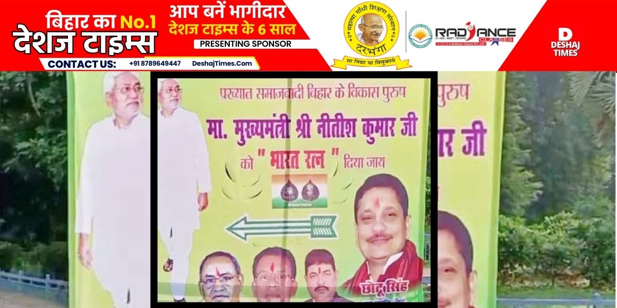 मुख्यमंत्री नीतीश कुमार को ‘भारत रत्न’ देने की मांग की गई है। इस पोस्टर को जेडीयू के प्रदेश महासचिव छोटू सिंह ने लगाया है, इसमें लिखा है, “प्रख्यात समाजवादी बिहार के विकास पुरुष माननीय मुख्यमंत्री नीतीश कुमार जी को भारत रत्न दिया जाए।”