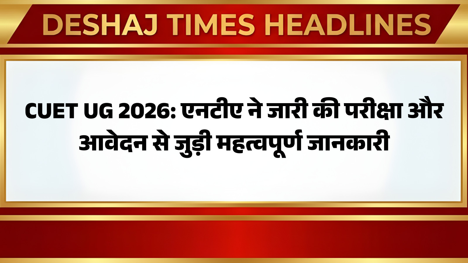 CUET UG 2026: नेशनल टेस्टिंग एजेंसी (NTA) ने देश की प्रमुख केंद्रीय, राज्य और कई निजी यूनिवर्सिटीज में अंडर ग्रेजुएट (UG) कोर्सेज में दाखिले के लिए आयोजित होने वाली CUET UG परीक्षा 2026 को लेकर अहम जानकारी साझा की है। हर साल लाखों छात्र इस परीक्षा में शामिल होते हैं, ऐसे में यह अपडेट उनके भविष्य के लिए बेहद महत्वपूर्ण है। आप पढ़ रहे हैं देशज टाइम्स बिहार का N0.1।