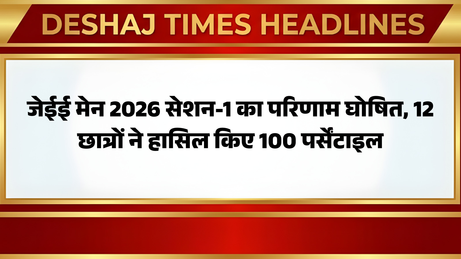 राष्ट्रीय परीक्षण एजेंसी (NTA) ने इंजीनियरिंग प्रवेश परीक्षा जेईई मेन 2026 सेशन-1 के नतीजों की घोषणा कर दी है। उम्मीदवार अब आधिकारिक वेबसाइट jeemain.nta.nic.in पर जाकर अपना स्कोर कार्ड डाउनलोड कर सकते हैं। इस साल की परीक्षा में कुल 12 छात्रों ने 100 पर्सेंटाइल अंक प्राप्त किए हैं। यह ध्यान देने योग्य है कि टॉपर्स की सूची में सर्वाधिक उम्मीदवार राजस्थान राज्य से हैं। खास बात यह भी रही कि 100 पर्सेंटाइल प्राप्त करने वालों में कोई भी छात्रा शामिल नहीं है, सभी 12 लड़के ही इस उपलब्धि को हासिल कर पाए हैं। आप पढ़ रहे हैं देशज टाइम्स बिहार का N0.1।