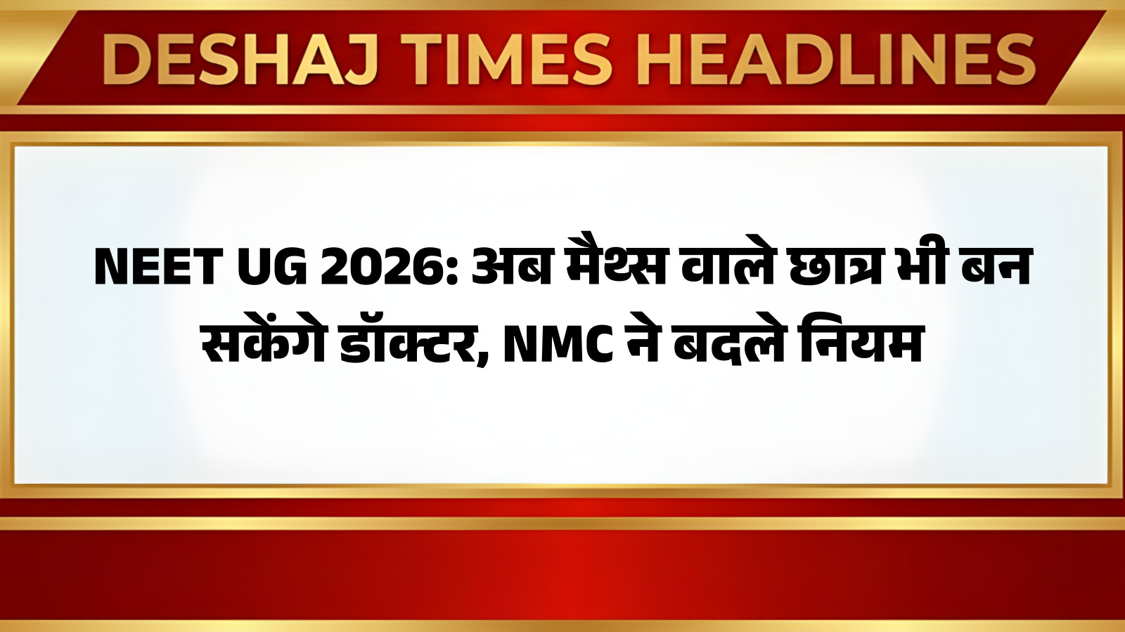 NMC ने NEET UG 2026 की प्रवेश परीक्षा के लिए पात्रता नियमों में एक बड़ा संशोधन किया है। नए नियमों के अनुसार, अब 12वीं में गणित विषय के साथ पढ़ाई करने वाले छात्र भी डॉक्टर बनने की दिशा में कदम बढ़ा सकते हैं। इस ऐतिहासिक फैसले से उन लाखों छात्रों को बड़ी राहत मिली है, जिन्होंने फिजिक्स, केमिस्ट्री और मैथ्स (PCM) स्ट्रीम चुनी थी, लेकिन अब वे मेडिकल क्षेत्र में अपना भविष्य बनाना चाहते हैं। आप पढ़ रहे हैं देशज टाइम्स बिहार का N0.1।