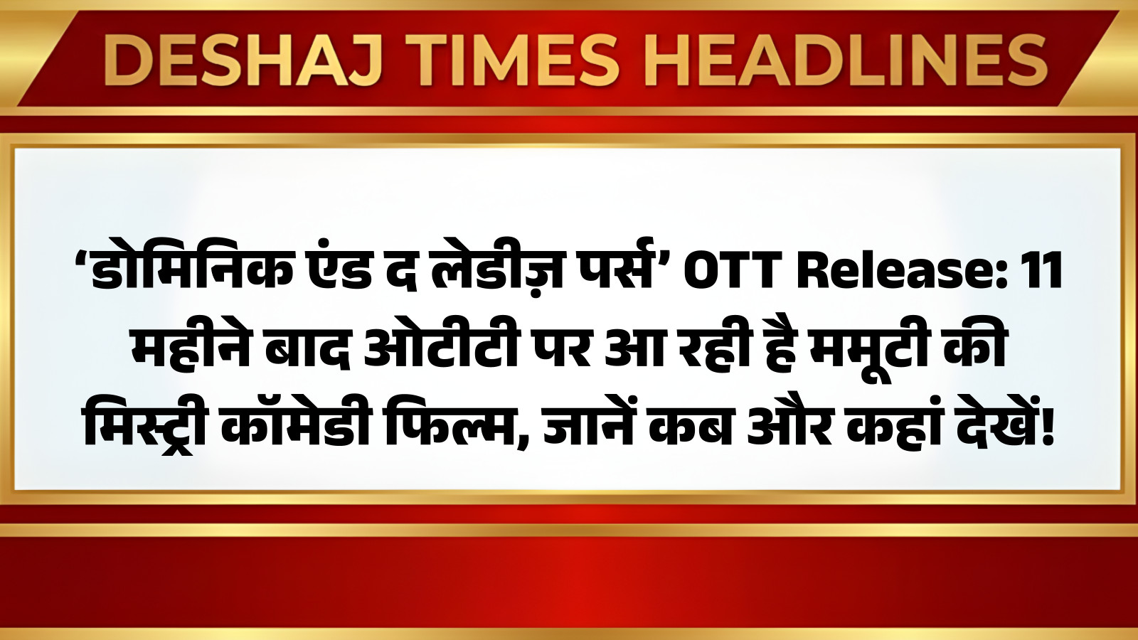 ममूटी की ‘डोमिनिक एंड द लेडीज़ पर्स’ अब घर बैठे फैंस आसानी से देख पाएंगे। फिल्म निर्माताओं ने सोशल मीडिया पर आधिकारिक घोषणा कर दी है कि यह मिस्ट्री कॉमेडी फिल्म 19 दिसंबर, 2025 से ओटीटी प्लेटफॉर्म जी5 (ZEE5) पर स्ट्रीम की जाएगी। आप पढ़ रहे हैं देशज टाइम्स बिहार का N0.1। फिल्म कंपनी ने पोस्टर साझा करते हुए लिखा, “सबसे मचअवेटेड फिल्म आ गई है!!! डोमिनिक एंड द लेडीज पर्स का प्रीमियर 19 तारीख को ZEE5 मलयालम पर होगा।”