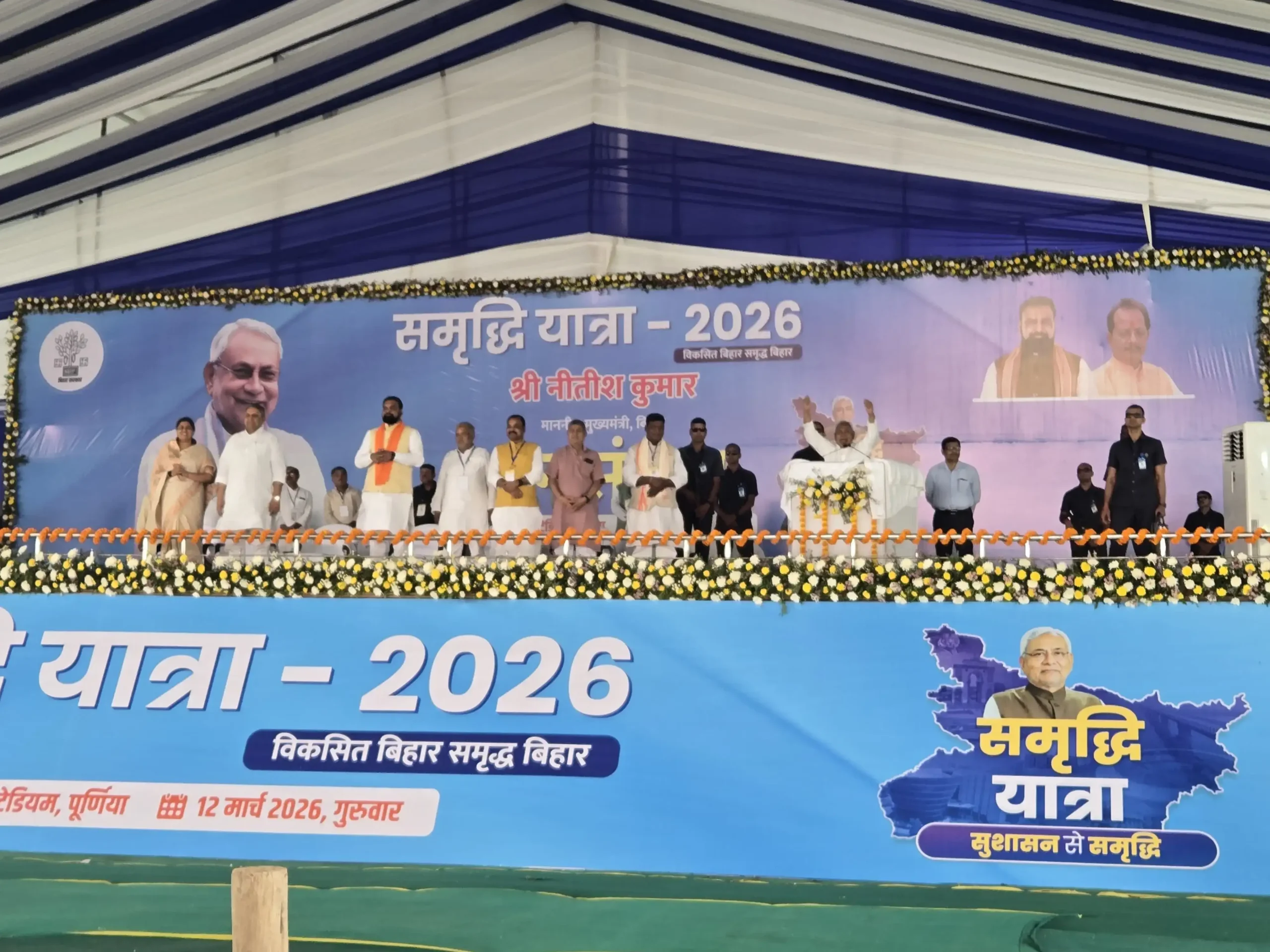 बिहार के मुख्यमंत्री नीतीश कुमार ने गुरुवार को अपनी समृद्धि यात्रा के दौरान पूर्णिया में विकास का पिटारा खोल दिया। वे हेलीकॉप्टर से सीधे पूर्णिया एयरपोर्ट पहुंचे, जहां से माता पूरण देवी मंदिर में पूजा-अर्चना कर उन्होंने प्रदेश की खुशहाली का आशीर्वाद मांगा। इसके बाद लगभग 11:30 बजे वे रंगभूमि मैदान पहुंचे, जहां राष्ट्रीय जनतांत्रिक गठबंधन (राजग) के नेताओं व कार्यकर्ताओं ने मखाने की माला पहनाकर उनका भव्य स्वागत किया। सभा को संबोधित करते हुए सीएम नीतीश ने कहा कि जब उन्हें बिहार की बागडोर मिली थी, तब राज्य की हालत बेहद खराब थी। आप पढ़ रहे हैं देशज टाइम्स बिहार का N0.1। कानून-व्यवस्था से लेकर सड़क, बिजली जैसी बुनियादी सुविधाओं का अभाव था, लेकिन उनकी सरकार ने इन सभी क्षेत्रों में लगातार काम कर प्रदेश को विकास की पटरी पर लौटाया।