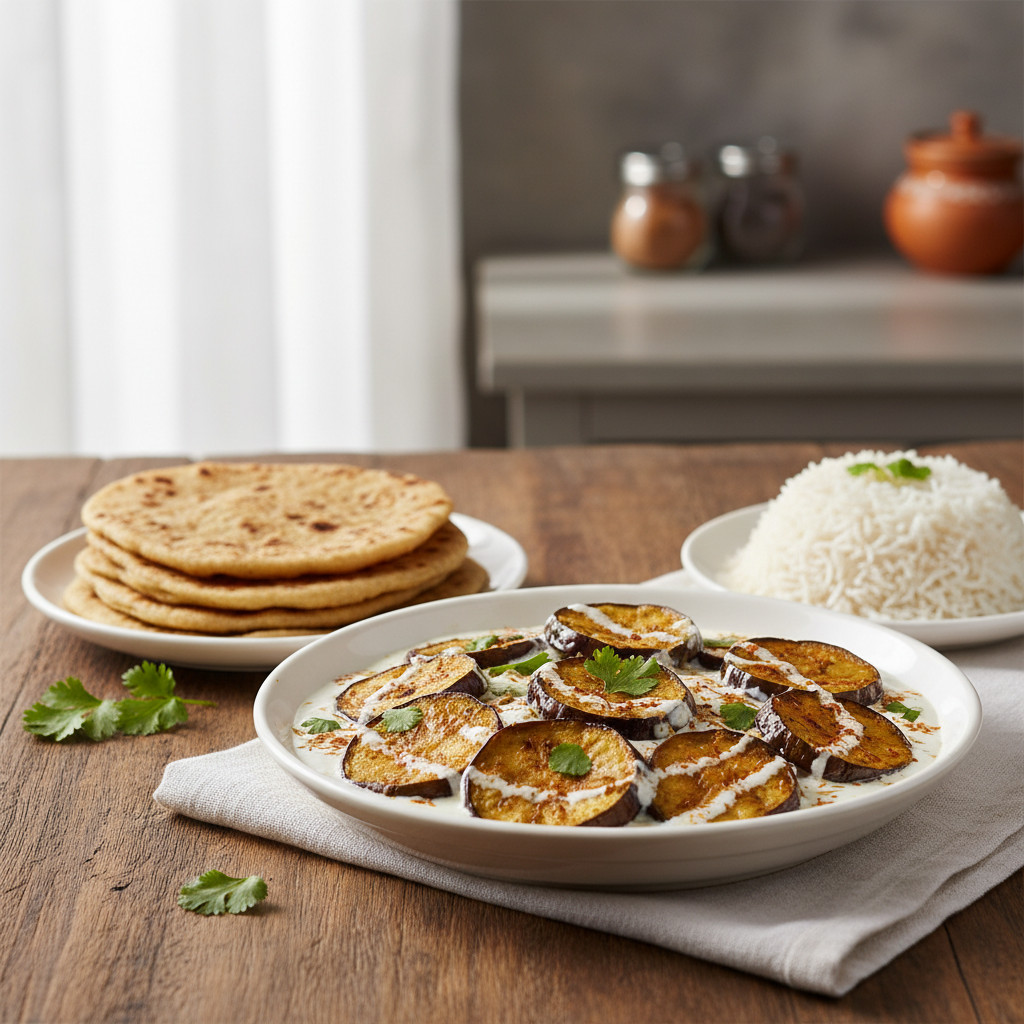 स्वादिष्ट दही बैंगन तैयार है! इसे गरमा-गरम पराठे, रोटी या पुलाव के साथ परोसें और इस लाजवाब व्यंजन का आनंद लें।