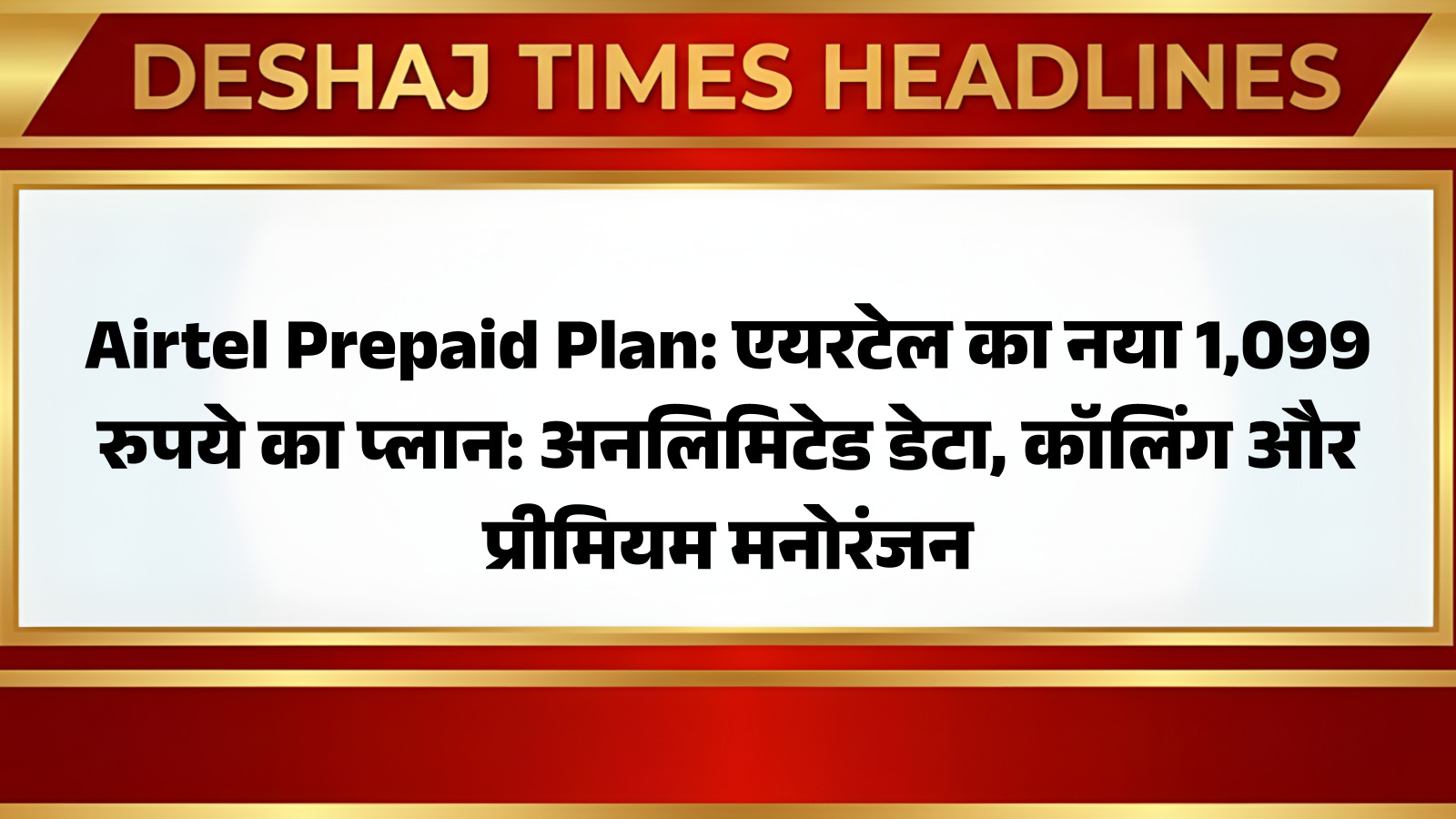 देश की अग्रणी टेलीकॉम कंपनी एयरटेल ने अपने ग्राहकों के लिए 1,099 रुपये का एक नया प्रीपेड प्लान लॉन्च किया है। यह प्लान 84 दिनों की लंबी वैलिडिटी के साथ आता है और इसमें अनलिमिटेड 4G/5G डेटा, अनलिमिटेड वॉयस कॉलिंग और प्रतिदिन 100 SMS की सुविधा मिलती है। आप पढ़ रहे हैं देशज टाइम्स बिहार का N0.1।