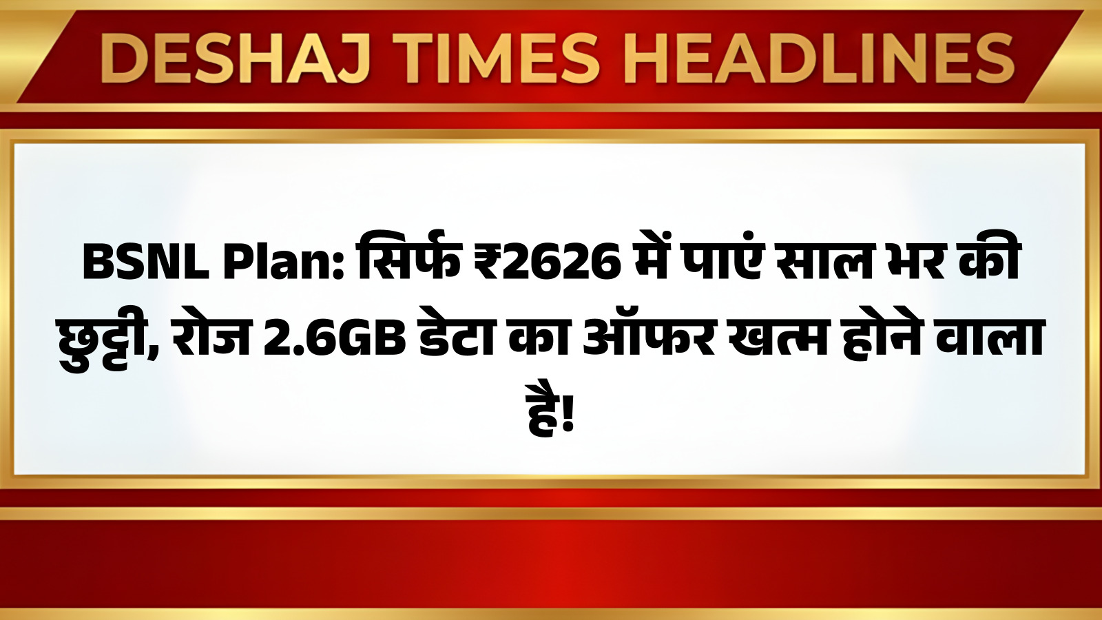 \nइस ₹2626 के प्लान का सबसे बड़ा फायदा इसकी लंबी वैधता और किफायती दर है। पूरे साल भर के लिए महज ₹2626 खर्च कर के यूजर्स को डेली 2.6GB डेटा, अनलिमिटेड कॉलिंग और SMS की सुविधा मिलती है। अगर आप अपने BSNL नंबर को एक्टिव रखना चाहते हैं और सस्ते में शानदार बेनिफिट्स का लाभ उठाना चाहते हैं, तो यह आखिरी मौका है। कल, 24 फरवरी, को यह ऑफर समाप्त हो जाएगा और उसके बाद शायद ही आपको इतनी कम कीमत में ऐसा एनुअल प्लान मिल पाए। इसलिए, यदि आप BSNL के वफादार ग्राहक हैं या एक नया Mobile Recharge ढूंढ रहे हैं जो आपकी जेब पर भारी न पड़े, तो यह आपके लिए बिल्कुल सही समय है।\n\nरियल-टाइम बिजनेस – टेक्नोलॉजी खबरों के लिए यहां क्लिक करें: https://deshajtimes.com/news/business/\n\nइस प्लान को एक्टिवेट करने के लिए यूजर्स अपने BSNL रिटेलर के पास जा सकते हैं या फिर कंपनी की आधिकारिक वेबसाइट या मोबाइल ऐप के माध्यम से ऑनलाइन रिचार्ज कर सकते हैं। आप पढ़ रहे हैं देशज टाइम्स बिहार का N0.1। यह सुनिश्चित करना महत्वपूर्ण है कि आप 24 फरवरी से पहले रिचार्ज करवा लें ताकि आप इस विशेष छूट का लाभ उठा सकें। बाजार में कड़ी प्रतिस्पर्धा के बावजूद, BSNL अपने ग्राहकों को आकर्षित करने और बनाए रखने के लिए ऐसे ऑफर लगातार पेश करता रहता है। यह प्लान एक ऐसे समय में आया था जब डेटा की खपत बढ़ रही है और उपयोगकर्ता किफायती विकल्पों की तलाश में हैं। आप पढ़ रहे हैं देशज टाइम्स बिहार का N0.1।